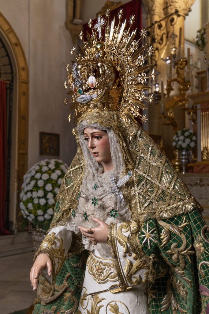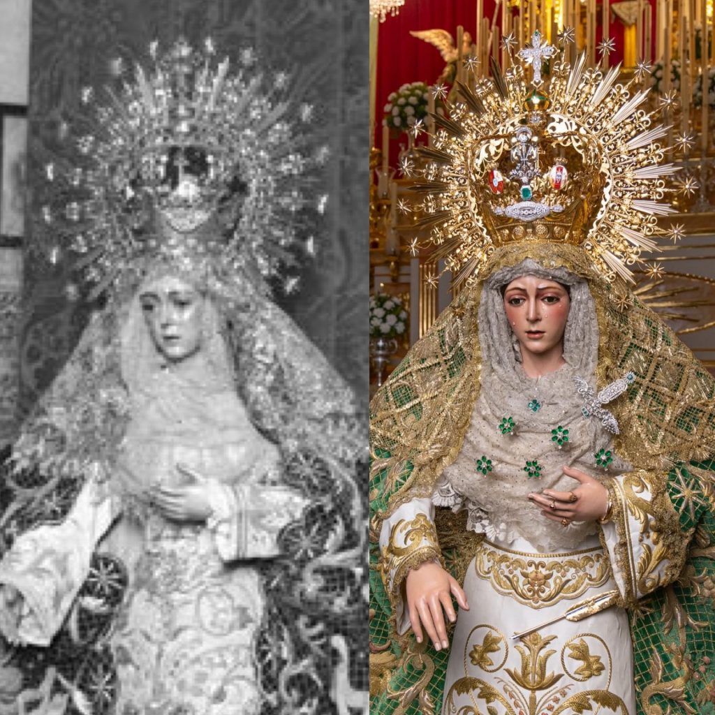 El resultado no ha podido ser más acertado. Más allá de la cuidada recreación histórica, la Santísima Virgen ha estrenado las manos que se encargan de su atavío. El jerezano José Carlos Gutiérrez ha preparado a la Esperanza Macarena con un resultado impecable y de fuerte carácter histórico, difícil de recordar incluso para muchos macarenos y devotos. El rostro de la Virgen se presenta enmarcado por un tocado que evoca los azulejos de la primera mitad del siglo XX, reforzando aún más esa mirada al pasado.