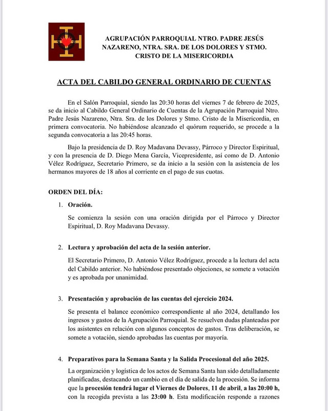La Agrupación Parroquial de Nuestro Padre Jesús Nazareno, Nuestra Señora de los Dolores y el Santísimo Cristo de la Misericordia ha anunciado el cambio de su tradicional salida procesional del Viernes Santo al Viernes de Dolores, programada para el próximo 11 de abril de 2025 a las 20:00 horas. Esta decisión fue aprobada durante el Cabildo General Ordinario de Cuentas en presencia del Párroco, D. Roy Madavana Devassy, el Vicepresidente, Diego Mena García, y el Secretario Primero, Antonio Vélez Rodríguez.